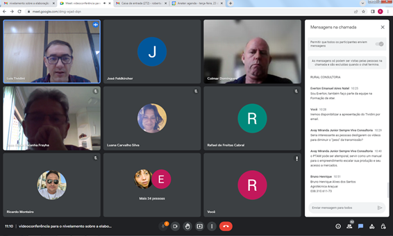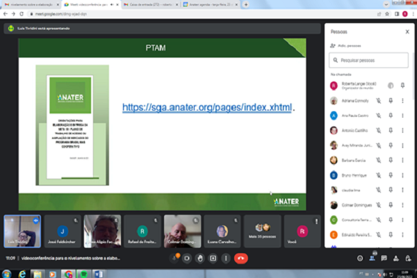 Com a finalidade de orientar as empresas contratadas na execução do Programa Brasil Mais Cooperativo, a Agência Nacional de Assistência Técnica e Extensão Rural (Anater) promoveu uma videoconferência, esclarecendo pontos do Edital de Chamada Pública de Ater nº 004/2021. O foco foi nivelar a elaboração do Plano de Trabalho de Acesso ou Ampliação de Mercados, item exigido para a prestação dos serviços de Assistência Técnica e Extensão Rural (Ater) aos beneficiários. A política pública visa a qualificação comercial e a geração de negócios para mais de 200 empreendimentos familiares em onze estados (AM, BA, MA, MS, MG, PB, PE, RJ, RN, RR e TO).