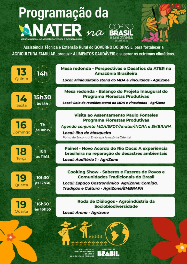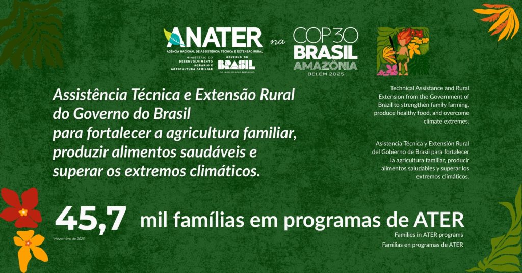 Onze programas executados pela Agência Nacional de Assistência Técnica e Extensão Rural (Anater), vinculada ao Ministério do Desenvolvimento Agrário e Agricultura Familiar (MDA), alcançam 45,7 mil unidades familiares de produção agrícola (UFPA), e um número superior de famílias, em todo o território nacional. A execução desses programas está investindo R$ 380 milhões do Governo do Brasil, Fundo Amazônia e Floresta+Amazônia (PNUD).