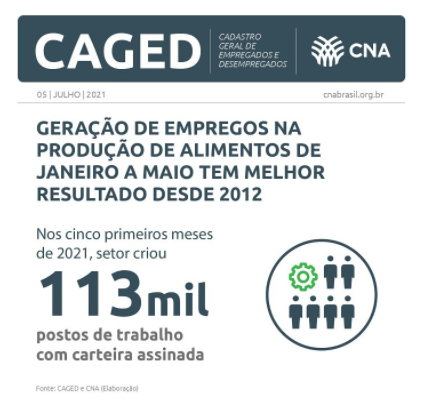 A produção de alimentos teve, de janeiro a maio de 2021, o melhor resultado na geração de empregos desde 2012, com a criação de 113 mil postos com carteira assinada no setor. A análise, feita com base no Cadastro Geral de Empregados e Desempregados (Caged), do Ministério da Economia, está no último Comunicado Técnico da Confederação da Agricultura e Pecuária do Brasil (CNA).
