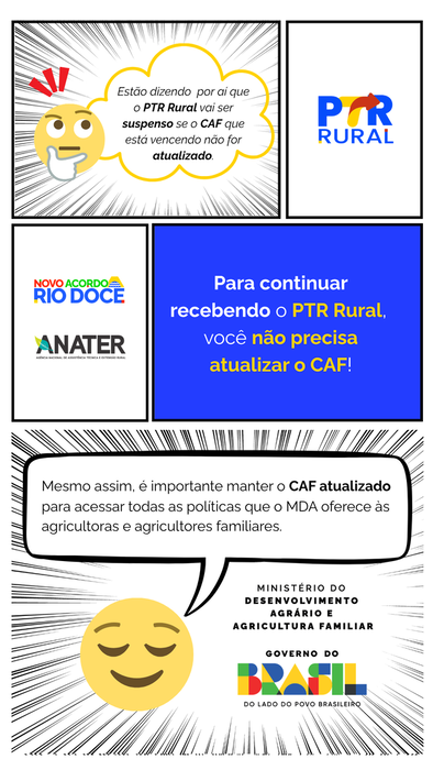 Para continuar recebendo o PTR Rural não é necessário atualizar o CAF. Mesmo assim, é importante mantê-lo atualizado para acessar todas as políticas que o MDA oferece às agricultoras e agricultores familiares.